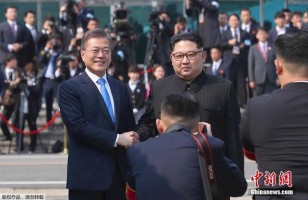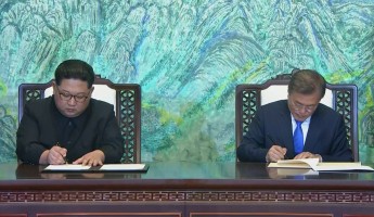 NOORD- KOREA- President Moon Jae-in en Kim Jong-un, de leiders van Noord- en Zuid-Korea, hebben vrijdag aan het slot van hun topontmoeting afgesproken dat ze permanente vrede willen. Ook willen ze geen nucleaire wapens meer op het Koreaanse schiereiland.