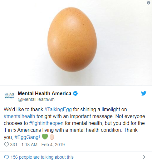De non-profitorganisatie Mental Health America bedankt het ei op haar Twitter-account voor de "belangrijke boodschap".