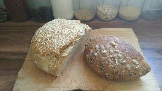 Een wit desembrood met sesamzaad en een roggezuurdesembrood met pompoenpitten (Foto: Privécollectie Lisa Peters)